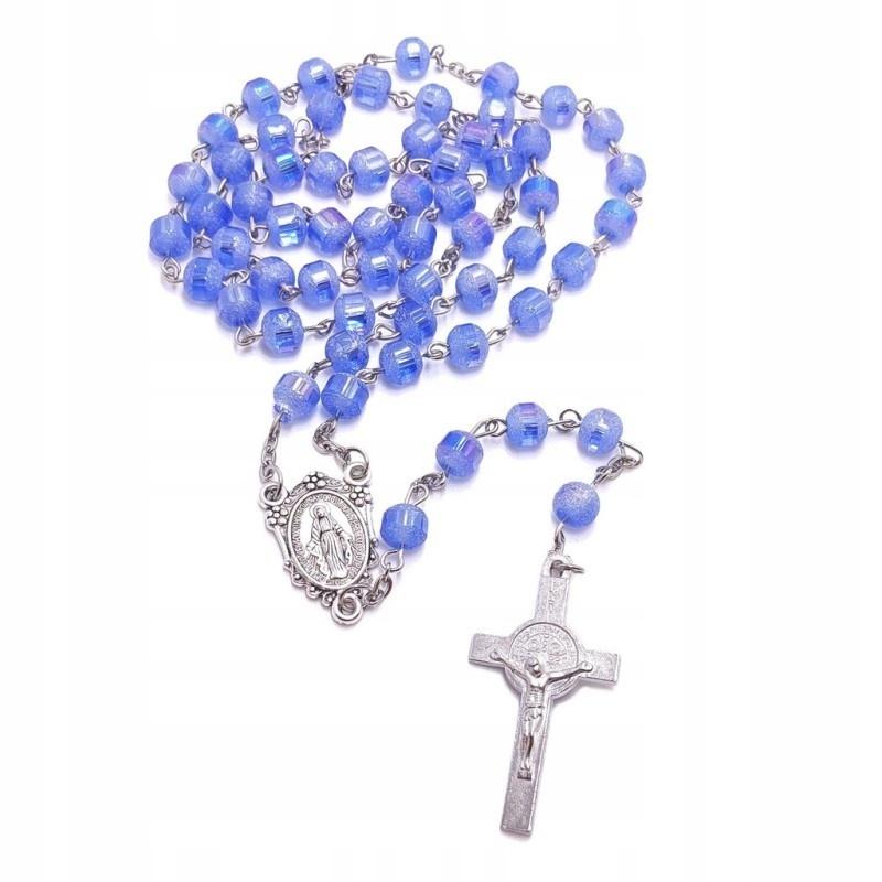 Szklany Różaniec Jasnoniebieski - Matka Boża Niepokalana, Szronione Koraliki.