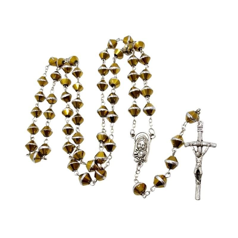 Elegancki design: Szlifowane szklane koraliki w złotym kolorze ze srebrnymi zdobieniami nadają różańcowi luksusowy wygląd.