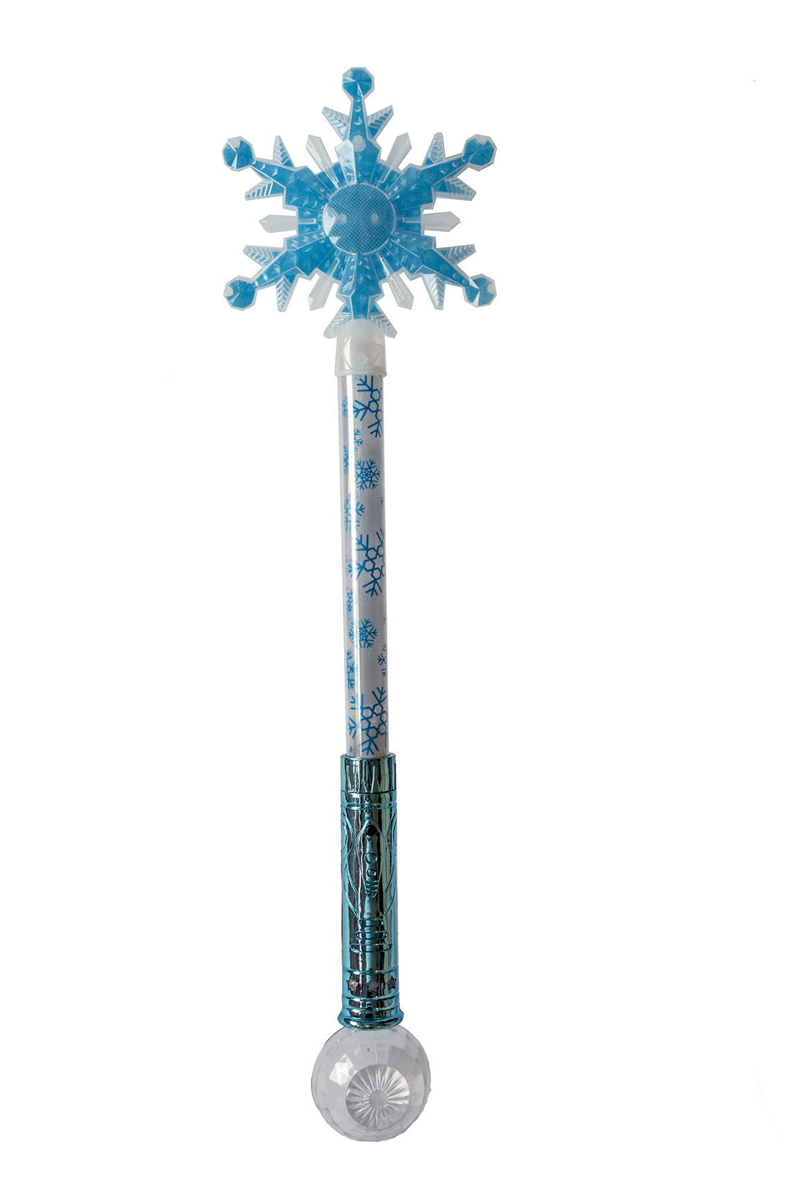 Świecąca różdżka do zabawy o wysokości 54 cm, na zakończeniu płatek śniegu. Zabawka zasilana 3 bateriami AA, nie dołączone.
