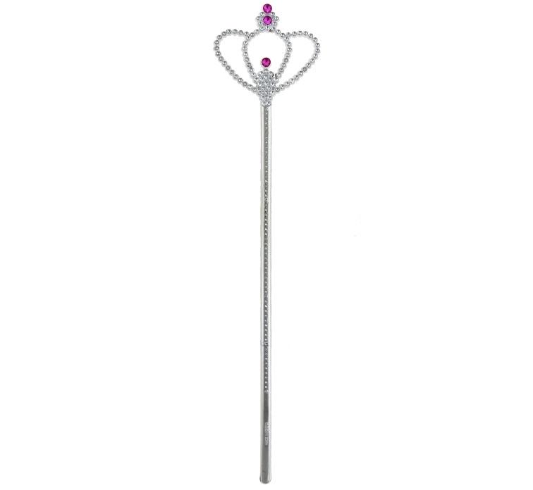 Różdżka, 34 cm Różdżka w kształcie berła wykonana z białych i srebrnych koralików. Górna część zdobiona różowymi cyrkoniami. Długość: 34 cm.