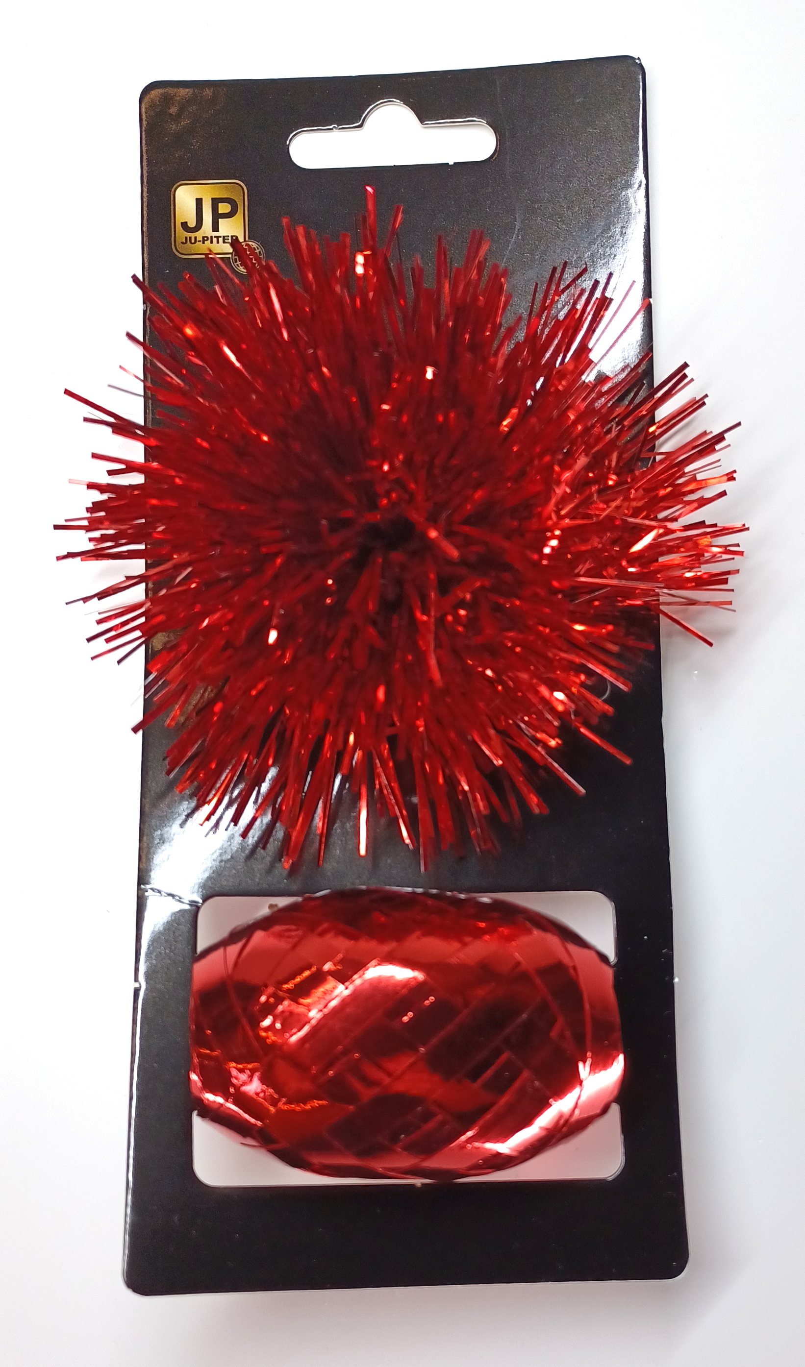 Znajdziesz w nim samoprzylepną rozetkę pompon , wstążkę nawiniętą na motek.