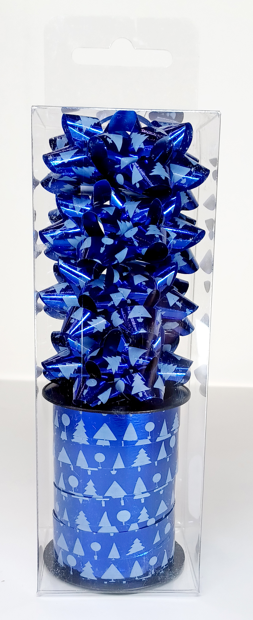 Zestaw dodatków do pakowania prezentów, kokardki samoprzylepne i wstążka w kolorze granatowym z motywem świątecznym.