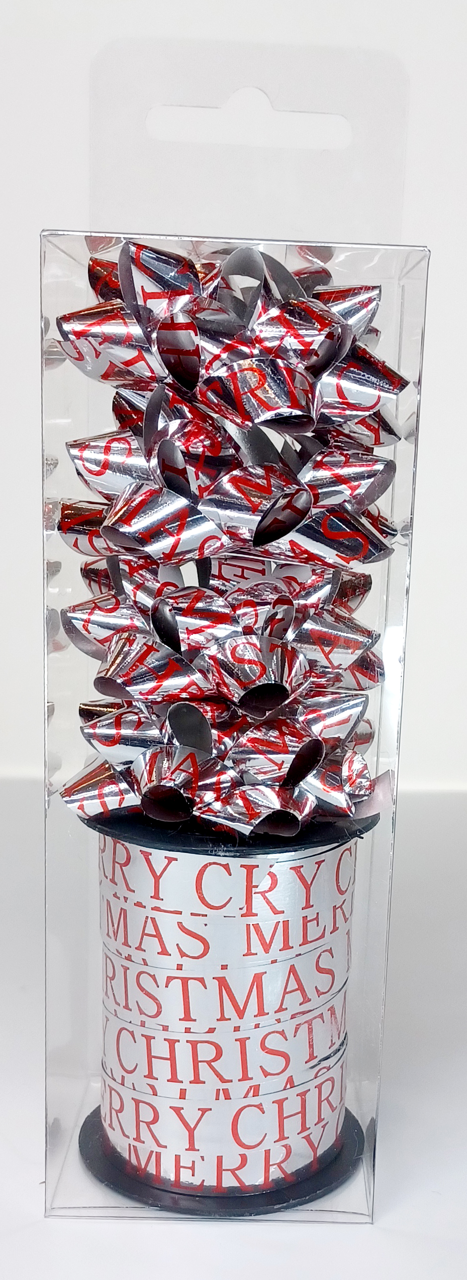 Zestaw dodatków do pakowania prezentów, kokardki samoprzylepne i wstążka w kolorze srebrnym z napisem czerwonym Merry Christmas.