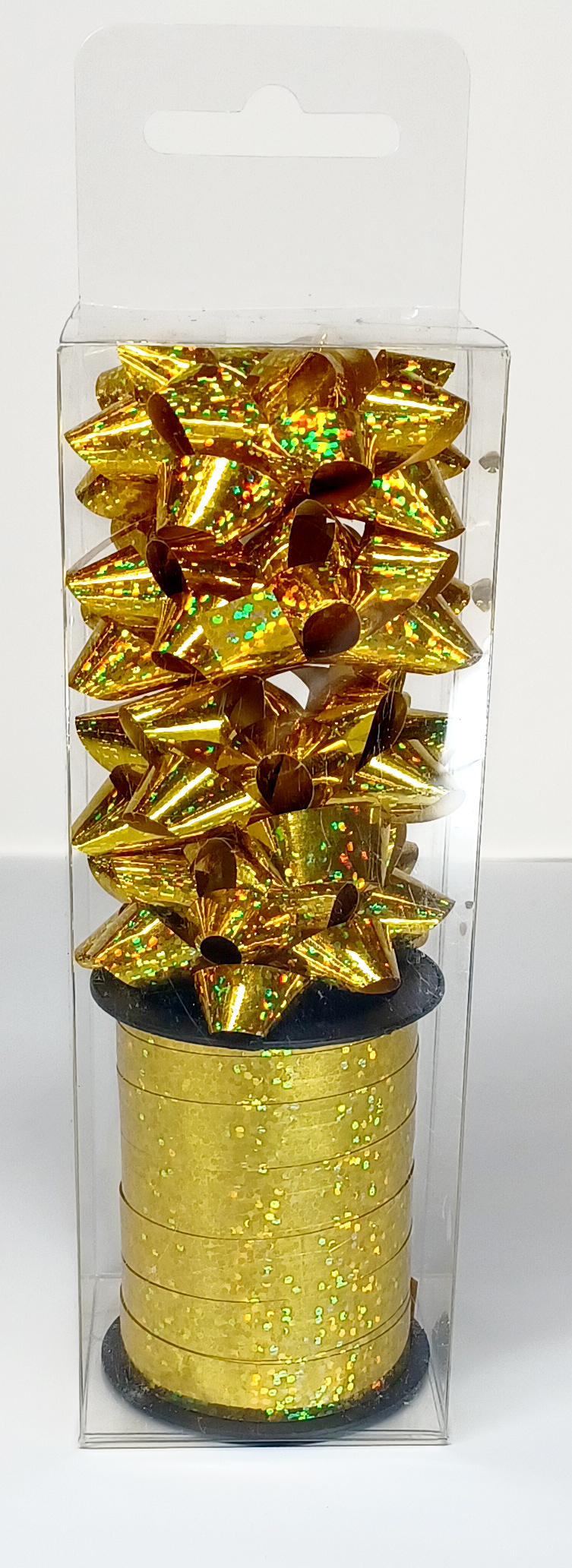 Zestaw dodatków do pakowania prezentów, kokardki samoprzylepne i wstążka w kolorze złotym.
