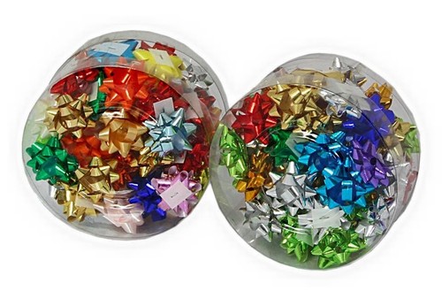 Zestaw 100 kolorowych mini rozetek o średnicy 2,5 cm, wykonanych z błyszczącej wstążki.