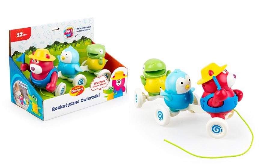 Pociąg z trzema wesołymi pasażerami czeka na przejażdżkę! Zabawka wyposażona jest w sznureczek do prowadzenia rączką. Podczas jazdy, zwierzaki kołyszą się na boki, podobnie jak kółeczka pojazdu, które ozdobione są wzorkiem, przez co ich poruszanie się wywołuje ciekawy efekt wizualny. Pociąganie za sznureczek uruchamia zabawne dźwięki i melodie, które umilą zabawę.
