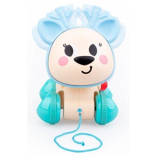 Uroczy jelonek aż kołysze się do zabawy! Posiada sznureczek do prowadzenia i cztery kółeczka o nieregularnym kształcie, co zapewnia ciekawy efekt wizualny. Dodatkowo, można je rozpędzić, aby postawiony na podłodze zwierzak pojechał samodzielnie do przodu. Podczas jazdy, zabawka wesoło kręci główką. Na boku jelenia siedzi kolorowy motylek, który przy przesuwaniu wydaje terkoczący odgłos