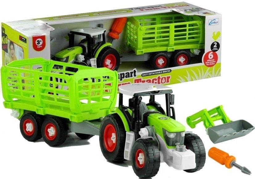Rozkręcany traktor z przyczepką + śrubokręt Farmerski traktor z otwieraną przyczepką do przewozu zwierzątek lub narzędzi będzie rewelacyjnym przedmiotem, który spodoba się małej złotej rączce - co ciekawe, do zestawu dołączony jest śrubokręt, który sprawi, że klasyczna zabawa nabierze zupełnie innego wymiaru. Zabawkowy śrubokręt umożliwia dziecku demontaż wybranych elementów - chłopiec może przekształcać pojazd według własnego pomysłu. Jak? Można odczepić przyczepkę, ramię na wysięgniku, a nawet koła. Uważamy, że jest to produkt, który będzie trafionym prezentem dla każdego dziecka: zarówno tego, które lubi bawić się samo, jak i dla zwolennika wspólnych zajęć. Zabawa z prezentowanym pojazdem sprawi, że każdy kilkulatek rozwinie swe zdolności motoryczne, pobudzi wyobraźnię i kreatywność. Funkcja demontażu poszczególnych elementów zabawki sprawi, że dziecko usprawni swe logiczne myślenie, a także pewność siebie - możliwość samodzielnej zabawy z użyciem śrubokręta będzie dla każdego chłopca wielkim wydarzeniem i rewelacyjnym doświadczeniem, które pozwoli poczuć się jak tata. Traktor z otwieraną, zabudowaną przyczepką, a także ruchomym ramieniem na wysięgniku łączy się w zestaw ze śrubokrętem z wymienną końcówką i śrubkami. Zabawka wykonana jest z atestowanego plastiku, co jest gwarancją długiej żywotności zabawki. Pojazd i przyczepka osadzone są na plastikowych, obrotowych kołach, dzięki czemu zestawem można bawić się zarówno w domu, jak i w ogródku czy na placu zabaw. Kolorystyka zabawki jest bardzo przyjemna dla wzroku, połączenie zieleni z czarnymi, szarymi i czerwonymi elementami przyciągnie wzrok każdego dziecka. Zabawka wykonana jest z wysokogatunkowego, solidnego plastiku, przeznaczona jest dla dzieci powyżej 3. roku życia. Traktor posiada certyfikat CE, zapakowany jest w estetyczny kartonik z otwartą witrynką. Wymiary zabawki: - traktor: 19,5 cm x 12 cm x 10,5 cm, - traktor z przyczepką: 43 cm x 12 cm x 10,5 cm, - ramię na wysięgniku: 14 cm x 8 cm x 9 cm, - przyczepka: 25 cm x 9 cm x 11 cm. Wymiary opakowania: - 51,5 cm x 16 cm x 17 cm.