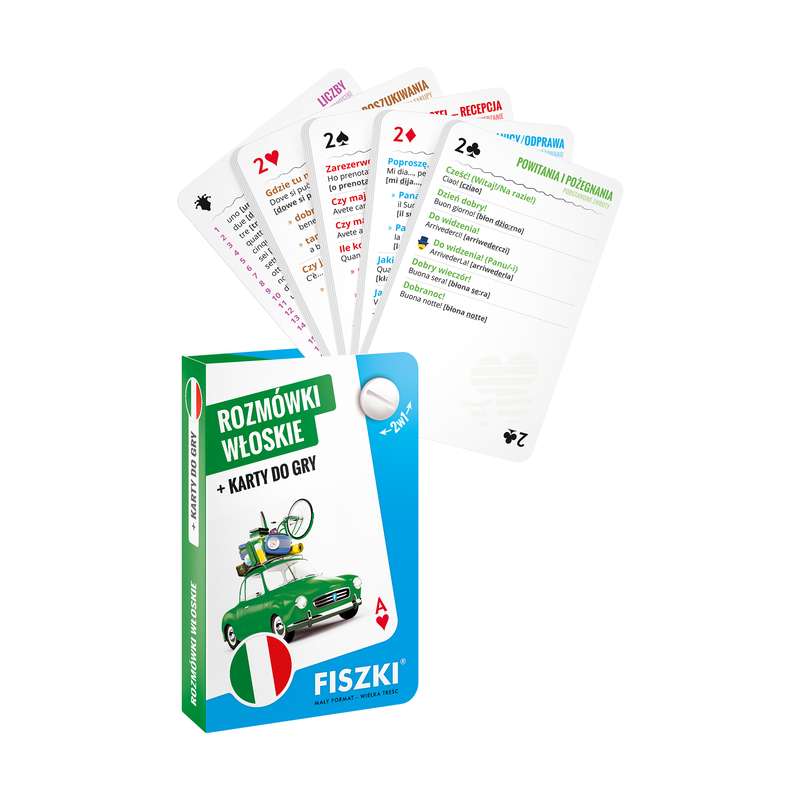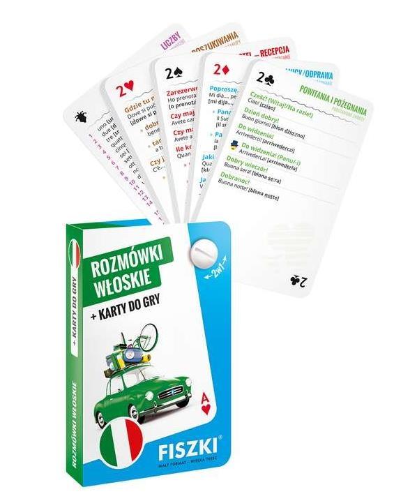 2w1, czyli minirozmówki i karty do gry w jednym! Na kartach szybko odnajdziesz potrzebne słowa i zwroty. A w czasie nudy czy niepogody zagrasz nimi w brydża czy ułożysz pasjansa. 350 niezbędnych słów i zwrotów w 4 kategoriach: - podstawowe zwroty - podróżowanie - noclegi i zwiedzanie - jedzenie i zakupy