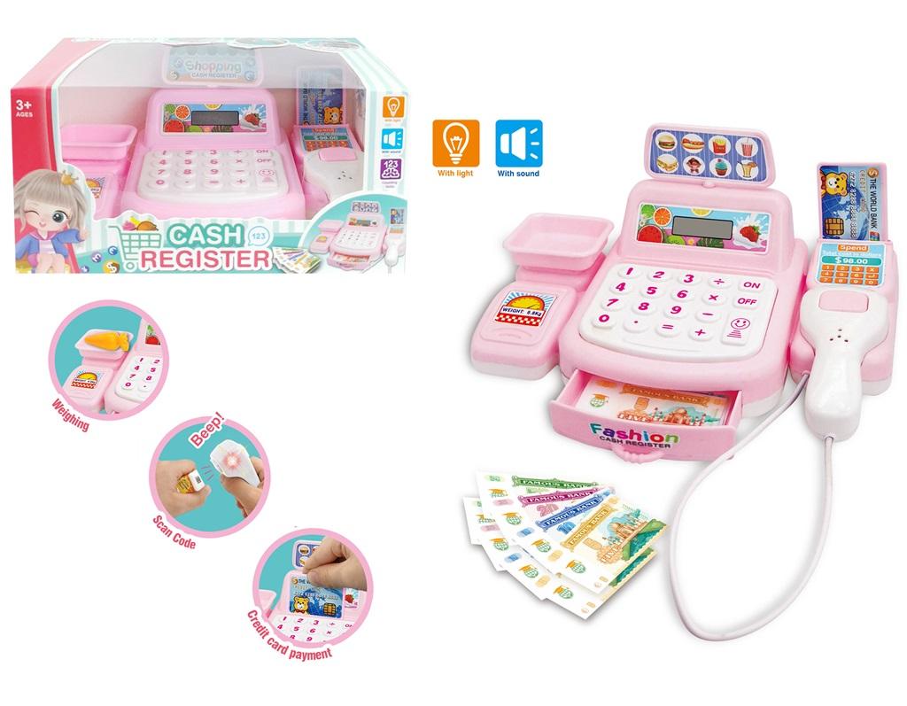 Różowa kasa sklepowa z czytnikiem, wagą i pieniążkami. Kasa na baterie.