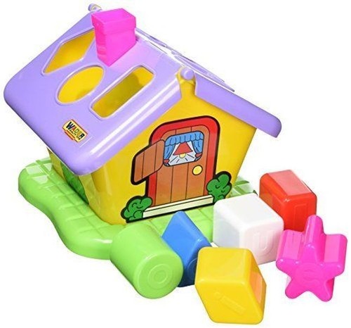 Rozwijająca zabawka - domek z kształtami. W zestawie 6 klocków o różnych kształtach, które trzeba dopasować do odpowiednich otworów. Wiek 1+