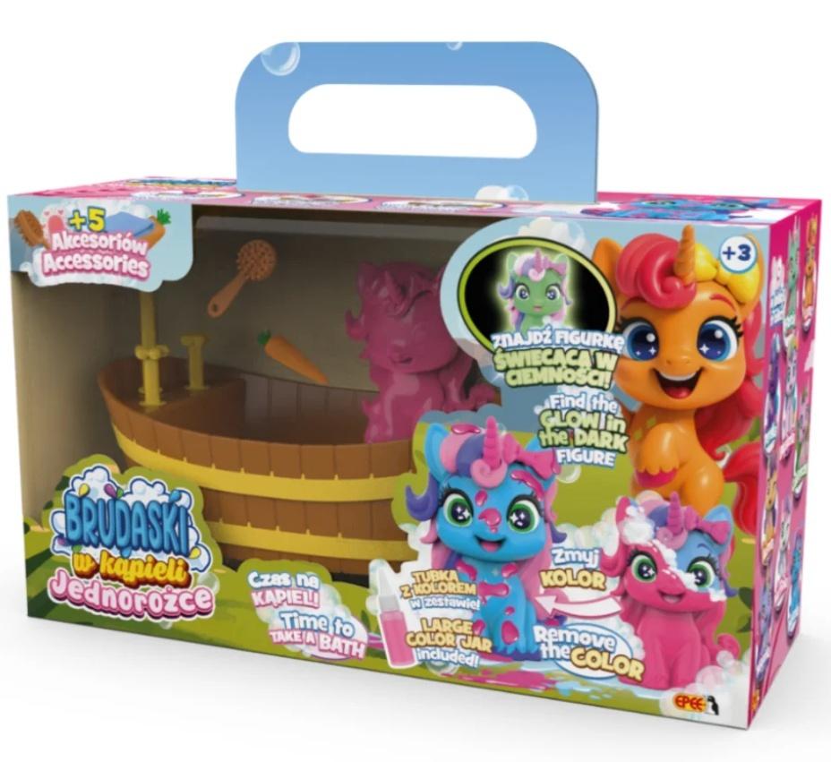 Zawartość opakowania: 1 figurka jednorożca, 1 tubka z różowym błotkiem, 5 akcesorium, 1 wanienka z natryskiem.