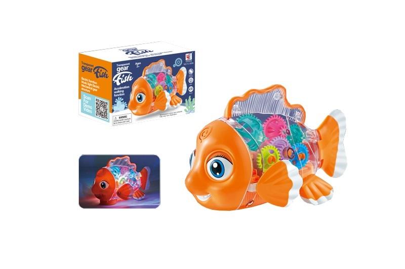 Funkcje: 1 tryb uruchamia efekty świetlne, 2 tryb uruchamia: jazdę i odbijanie od przeszkód, poruszanie oczami i płetwami, efekty świetlne, 5 melodii, obrotowe zębatki w różnych kształtach wewnątrz rybki, wym. Rybki: 19 x 12 x 9 cm.