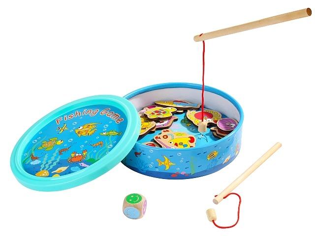 Zabawka zawiera 18 różnych rybek, dwie wędki oraz kostkę.