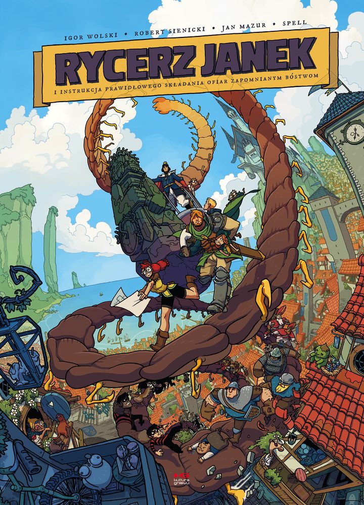 W królestwie Zacnegostawu nie dzieje się dobrze. Poziom przestępczości rośnie w zastraszającym tempie, królewska para pada ofiarą śmiertelnego wypadku, a książę Mścigniew, choć dopiero co objął tron, już wzbudza niepokój mieszkańców swoimi radykalnymi pomysłami i zamiłowaniem do okultyzmu. Jakby tego było mało, do stolicy przybywa pewien nieznajomy wędrowiec. Nie wiadomo do końca skąd przyszedł, ani kim jest. Prowadzony przez tajemniczą wiedźmę, a być może i samo przeznaczenie, zawsze pojawia się tam, gdzie potrzeba bohatera. Nie wiemy o nim nic, poza tym że jest miły. I silny. I prawy. No, wiemy też jak się nazywa. Mówią na niego Janek. Rycerz Janek. Przed Wami obłędna komedia fantasy, w której epickie ilustracje naszpikowane są absurdalnym humorem, a klasyczne wątki zostają wywrócone na lewą stronę. Autorami są czterej twórcy dobrze znani ze swoich autorskich projektów: Igor Wolski, Robert Sienicki, Jan Mazur i Tomasz Grządziela.