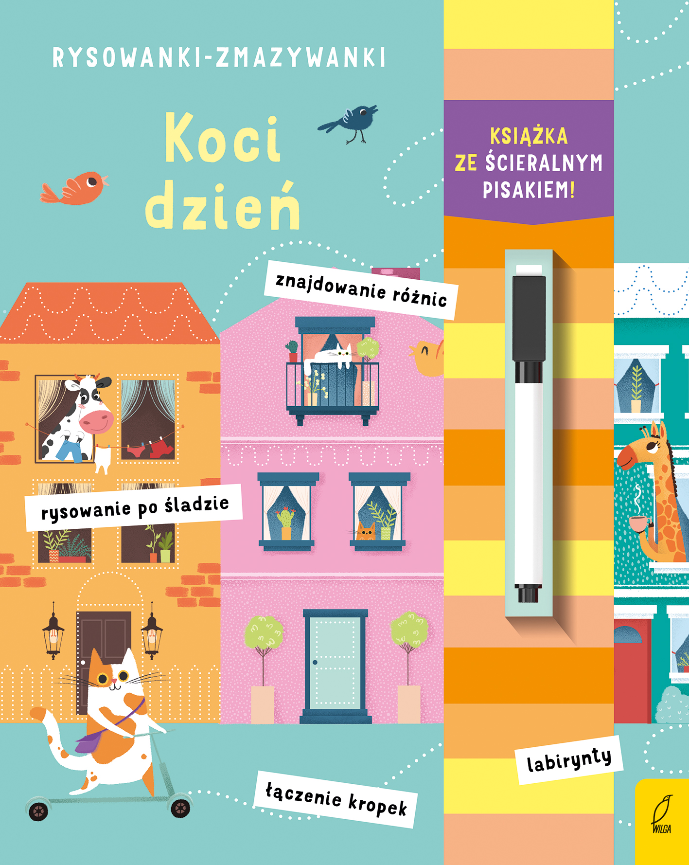 Rysowanki-zmazywanki to seria ze ścieralnym pisakiem, która dostarczy wiele zabawy na długie godziny! W każdej książce znajdują się różnorodne zadania do zmazywania – rysowanie szlaczków, łączenie kropek, odwzorowywanie kształtów – które usprawniają motorykę ręki, ćwiczą koncentrację i spostrzegawczość. Rysowanki-zmazywanki. Koci dzień Co robił kot w mieście? Z kim spotkał się w parku i gdzie pojechał taksówką? Dowiesz się tego, wykonując zadania z książki. Chwyć flamaster w dłoń i rysuj szlaczki, łącz kropki, szukaj różnic, rozwiązuj labirynty. Ścieraj, rysuj, baw się ze zwierzakami i ćwicz rękę!