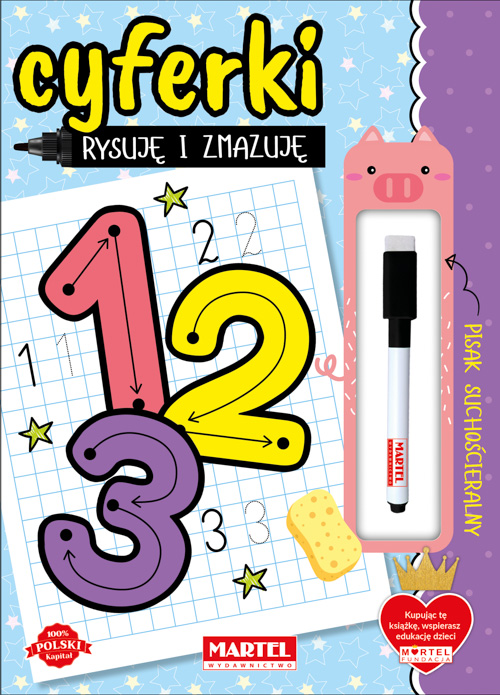 Ćwiczenia w konwencji zabawy pomagają dziecku pisać cyferki, liczyć oraz przyswajać proste działania matematyczne. Książeczka wspiera małą motorykę, przysposabiając rączkę do pisania. Regularne ćwiczenia wprowadzają dziecko do obowiązków szkolnych oraz uświadamiają, jak istotne jest precyzyjne liczenie. Dodany flamaster suchościeralny wspomaga dziecko w poprawianiu zadań.