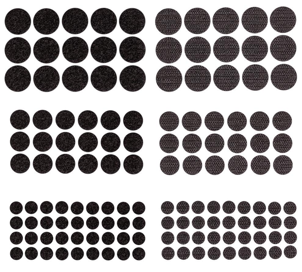 Zestaw czarnych rzepów samoprzylepnych w trzech rozmiarach pozwala na wielokrotne łączenie i rozdzielanie elementów.