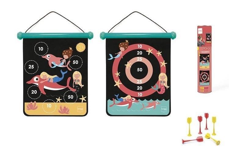 Dwustronne magnetyczne rzutki z motywem Syrenki i delfinów. Magnetyczna tarcza to bezpieczna zabawa zarówno dla młodszych jak i starszych wielbicieli rzutek. Gra polega na jak najbardziej precyzyjnym trafieniu rzutkami w tarczę, gdzie rozmieszczono punkty za każdy oddany rzut. Tarcza jest dwustronna co pozwala na zabawę na dwa różne sposoby.