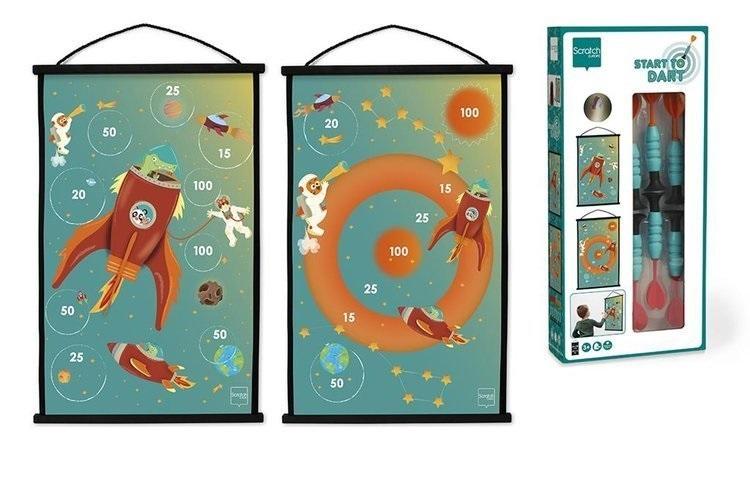 START TO DART - dwustronna tarcza z rzutkami z motywem kosmosu i rakiety . START TO DART - to bezpieczna zabawa dla młodszych wielbicieli rzutek. Gra polega na jak najbardziej precyzyjnym trafieniu rzutkami w tarczę, gdzie rozmieszczono punkty za każdy oddany rzut. Tarcza jest dwustronna co pozwala na zabawę na dwa różne sposoby. Do tarczy dołączono 6 sztuk bezpiecznych rzutek z gumową przyssawką. Dzięki temu rzutki mają odpowiednie wykończenie bezpieczne dla młodszych dzieci, które rozpoczynają zabawę w popularną grę w dart. Dart to znana i lubiana gra, która rozwija zręczność i koordynację ruchowo-wzrokową u dzieci.