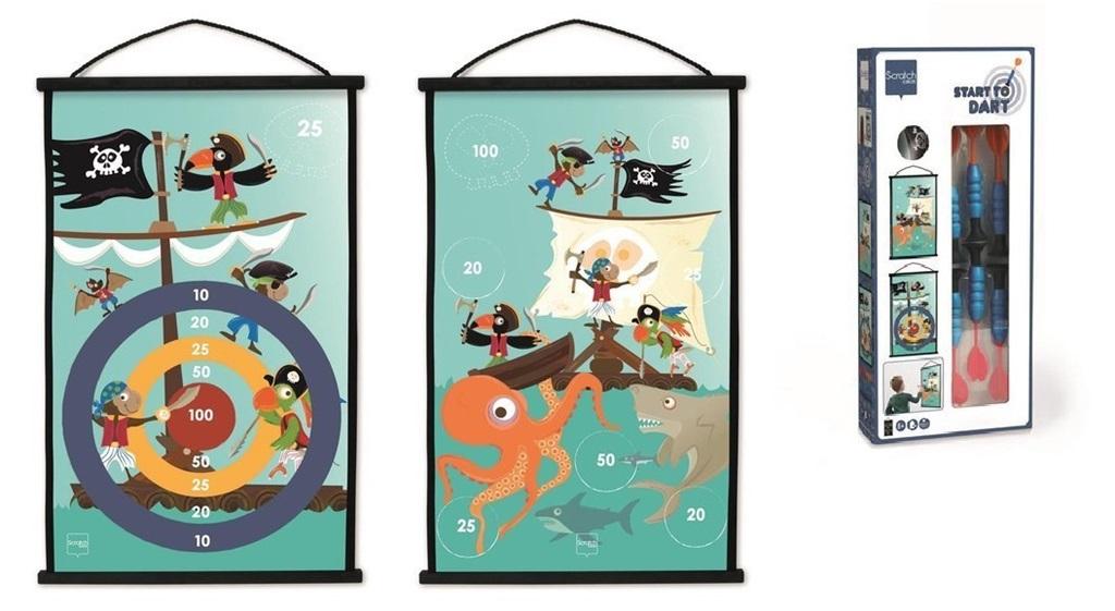 START TO DART _PIRACI - dwustronna tarcza z rzutkami z motywem Piratów. START TO DART - to bezpieczna zabawa dla młodszych wielbicieli rzutek. Gra polega na jak najbardziej precyzyjnym trafieniu rzutkami w tarczę, gdzie rozmieszczono punkty za każdy oddany rzut. Tarcza jest dwustronna co pozwala na zabawę na dwa różne sposoby. Do tarczy dołączono 6 sztuk bezpiecznych rzutek z gumową przyssawką. Dzięki temu rzutki mają odpowiednie wykończenie bezpieczne dla młodszych dzieci, które rozpoczynają zabawę w popularną grę w dart. Dart to znana i lubiana gra, która rozwija zręczność i koordynację ruchowo-wzrokową u dzieci.