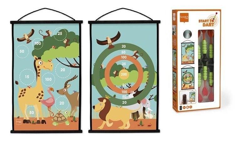 START TO DART _ SAFARI - dwustronna tarcza z rzutkami z motywem Safari. START TO DART - to bezpieczna zabawa dla młodszych wielbicieli rzutek. Gra polega na jak najbardziej precyzyjnym trafieniu rzutkami w tarczę, gdzie rozmieszczono punkty za każdy oddany rzut. Tarcza jest dwustronna co pozwala na zabawę na dwa różne sposoby. Do tarczy dołączono 6 sztuk bezpiecznych rzutek z gumową przyssawką. Dzięki temu rzutki mają odpowiednie wykończenie bezpieczne dla młodszych dzieci, które rozpoczynają zabawę w popularną grę w dart. Dart to znana i lubiana gra, która rozwija zręczność i koordynację ruchowo-wzrokową u dzieci.