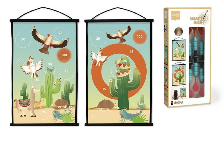 START TO DART Meksyk - dwustronna tarcza z rzutkami z motywem Meksyku, kaktusów, pustyni i pięknych ptaków. START TO DART - to bezpieczna zabawa dla młodszych wielbicieli rzutek. Gra polega na jak najbardziej precyzyjnym trafieniu rzutkami w tarczę, gdzie rozmieszczono punkty za każdy oddany rzut. Tarcza jest dwustronna co pozwala na zabawę na dwa różne sposoby. Do tarczy dołączono 6 sztuk bezpiecznych rzutek z gumową przyssawką. Dzięki temu rzutki mają odpowiednie wykończenie bezpieczne dla młodszych dzieci, które rozpoczynają zabawę w popularną grę w dart. Dart to znana i lubiana gra, która rozwija zręczność i koordynację ruchowo-wzrokową u dzieci.