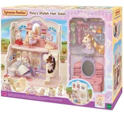 Salon fryzjerski panny kucyk to nowa atrakcja w Sylvanian Village. Mistrzyni fryzjerstwa Sally, panna kucyk, otworzyła swój własny salon, w którym teraz chce wyczarowywać najpiękniejsze fryzury dla wszystkich mieszkańców Sylvanian Village. Salon ma dwa piętra i każdy klient może rozsiąść się tu wygodnie w fotelu fryzjerskim, aby umyć oraz wymodelować mu włosy. Klienci przyjmowani są w recepcji, a następnie siadają w fotelu fryzjerskim. Po umyciu włosów w umywalce nadchodzi czas na założenie peleryny i układanie fryzury. Czy to spinki, czy warkocze, prostowanie, loki, czy kolorowe pasemka, z Sally prawie wszystko jest możliwe. Każdy klient może ocenić fryzurę przeglądając się w lustrze. Sally też ma bardzo długie włosy, które lubi układać, zaplatać w piękne warkocze, upinać lub ozdabiać ślicznymi spinkami. Zestaw Salon fryzjerski panny kucyk z figurką Sylvanian Families zawiera dwupiętrowy salon fryzjerski z otwieranymi drzwiami i schodami, toaletkę z lustrem, umywalkę z fotelem, kontuar, fotel obrotowy, pelerynę fryzjerską, kolorowe pasma włosów do wpinania, wiele akcesoriów fryzjerskich, spinki do włosów i figurkę panny Sally kucyk o długich włosach do układania fryzur. Aksamitnie miękka figurka ma ok. 6 cm. Głowa, ramiona i nogi są ruchome. Ubranka można zakładać i zdejmować. Produkt przeznaczony dla dzieci od trzeciego roku życia.