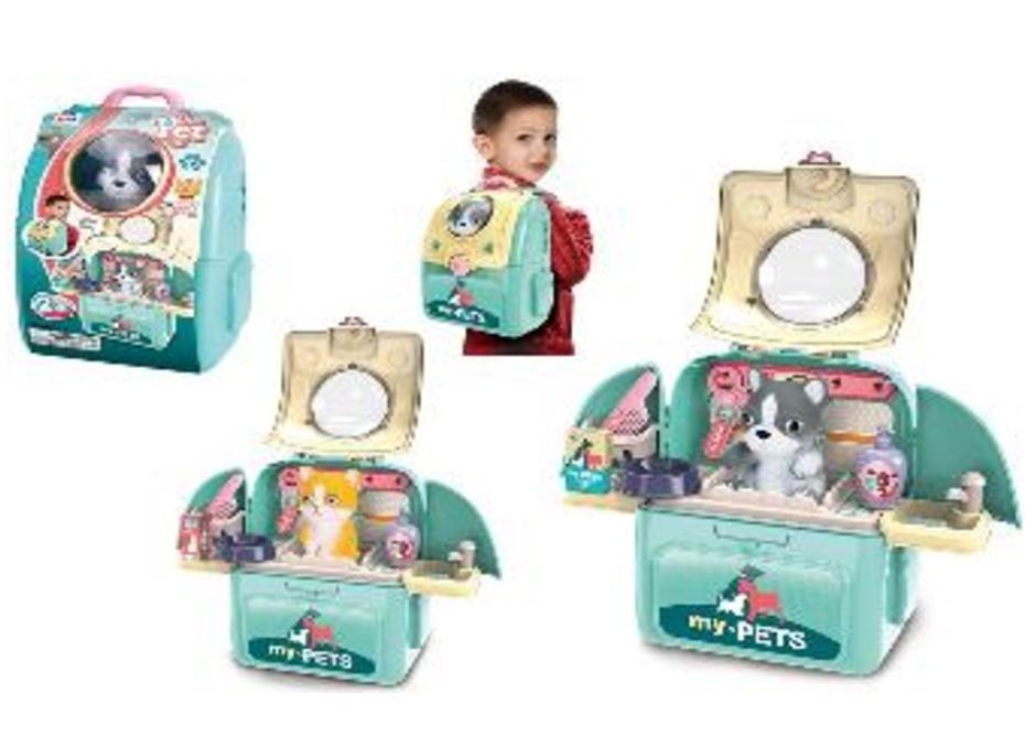 W zestawie: piesek, grzebień, kiska, kosmetyki, plecak otwiera się na boki i tworzy salon pielęgnacyjny