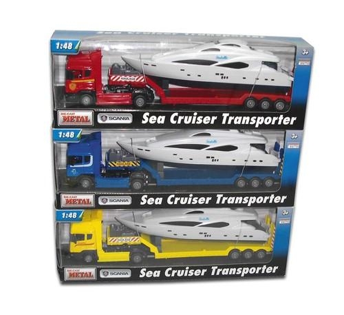 Metalowy model samochodu Scania z łodzią motorową na naczepie w skali 1:48 Zabawka nieodpowiednia dla dzieci poniżej 3-go roku życia.