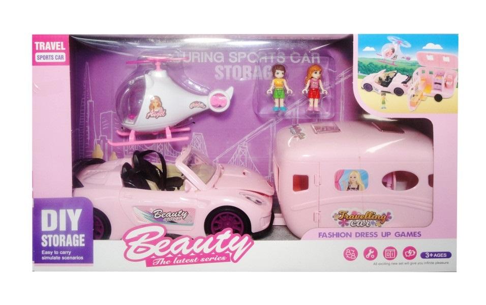 Plastikowe, auto dla lalki. Zabierz ją w niezwykłą podróż! Auto posiada otwierane drzwi, a po naciśnięciu guzika na masce świeci światełkiem. W zestawie także przyczepa kempingowa (w której znajduje się łóżko piętrowe, sofa, toaleta i kuchenka), 2 lalki oraz helikopter.#&Zabawka działa na baterie typu AG13. Baterie znajdują się w zabawce. #&Całość spakowana w kartonowe pudełko z przejrzystym okienkiem.#&Produkt przeznaczony dla dzieci powyżej 3 lat.#&Podane wymiary są wymiarami opakowania.