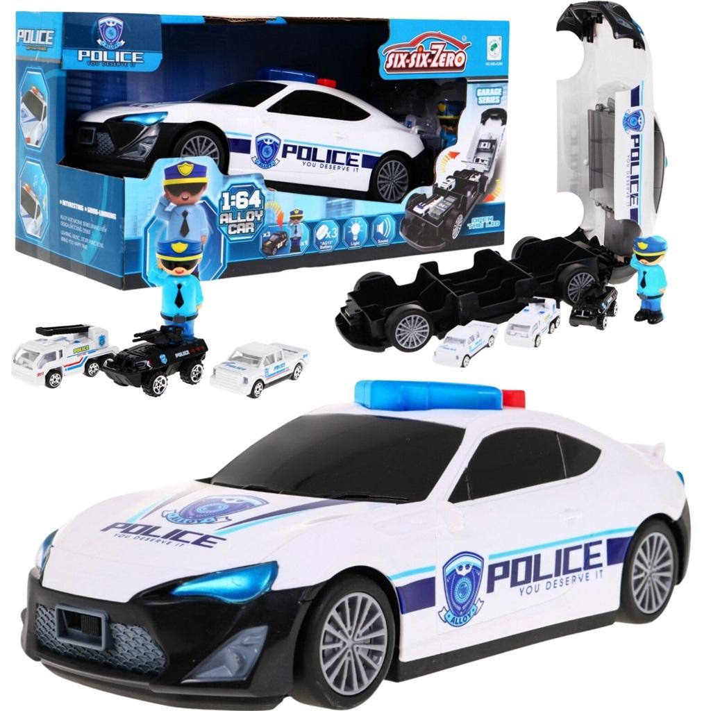 Wnętrze pojazdu zostało starannie zaprojektowane z przegródkami na samochodziki, co nie tylko organizuje przestrzeń, ale także sprawia, że jest to idealne miejsce do przechowywanie i transportu małych policyjnych aut. Dodatkowo, w zestawie znajduje się figurka policjanta, który pilnuje porządku na ulicach.