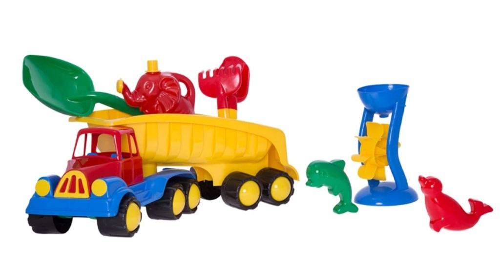Samochód ma aż 70 cm długości i skrętną naczepę. Dzięki dużej ładowności, każdy dzieciak będzie mógł nim przewieźć swoje najcenniejsze skarby. W zestawie znajdują się 2 foremki, łopatka, grabki, duża łopata o dł. 55 cm, młynek do przesypywania piasku oraz konewka Słoń.