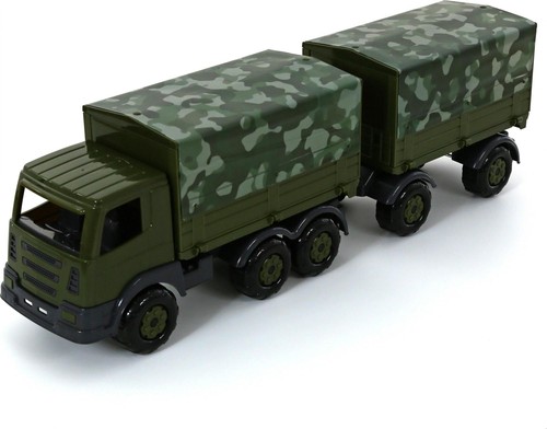 Pojazd z dodatkową przyczepą. Posiada koła o nierównej strukturze, dzięki którym sprawnie jeździ po zróżnicowanych nawierzchniach. Naczepa ciężarówki jak i jej przyczepa wyposażone są w burty, które można otworzyć. Plandeki umieszczone na stelażu, na obu częściach pojazdu można odpiąć i unieść do góry. Z przodu auta znajduje się miejsce na przywiązanie sznurka, dzięki czemu pojazd można ciągnąć. W kabinie kierowcy z kolei jest mnóstwo miejsca dla figurki ulubionego żołnierza. Wiek 1+
