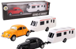 Wyrusz w podróż marzeń z metalowym zestawem samochodu z przyczepą kempingową marki PRO Kids! Ten realistyczny zestaw łączy klasyczny design auta z funkcjonalnością nowoczesnej przyczepy turystycznej, stwarzając idealną scenę do zabawy w podróże, biwaki i rodzinne wakacje. Samochód typu garbus o opływowym kształcie i błyszczącym lakierze przyciąga wzrok, a jego otwierane drzwi i funkcja pull-back dostarczają dynamicznych wrażeń podczas zabawy.