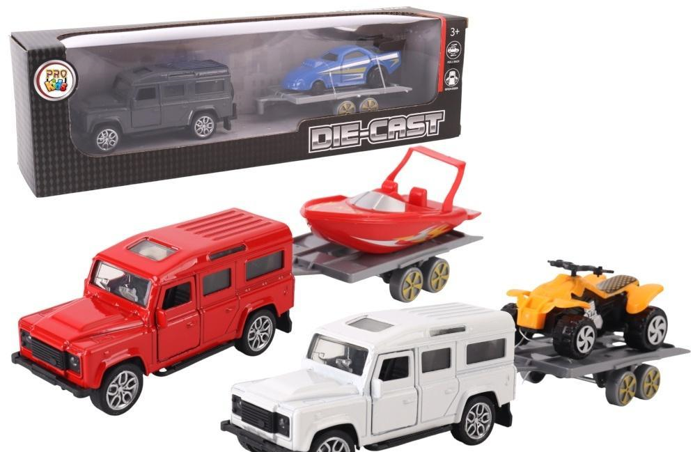 Pojazd główny terenówka z solidną, metalową karoserią zachwyca detalami i trwałością. Dzięki napędowi typu pull-back i otwieranym drzwiom zaprasza do wielokrotnych scenariuszy zabawy: załadunku, transportu i akcji ratunkowej. Przyczepa, mocowana na zaczep, mieści jedną z trzech wersji ładunków sportową łódź, kolorowego quad lub aerodynamiczny samochód wyścigowy każdy z nich stylizowany z dbałością o najmniejsze szczegóły.