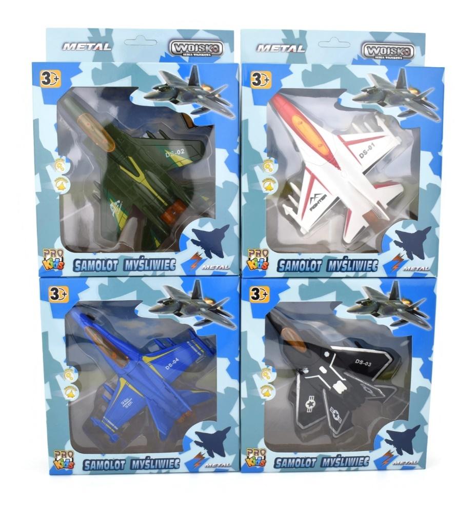Metalowy model myśliwca wojskowego. Dodele z zachowaniem wielu szczegulów. Myśliwce mają różn kształty i barwy lakieru. Do zebrania różne modle myśliwców. Stwórz spektakularną bitwę powietrzną. Każdy model samolotu jest z napędem ""Pull Back"".