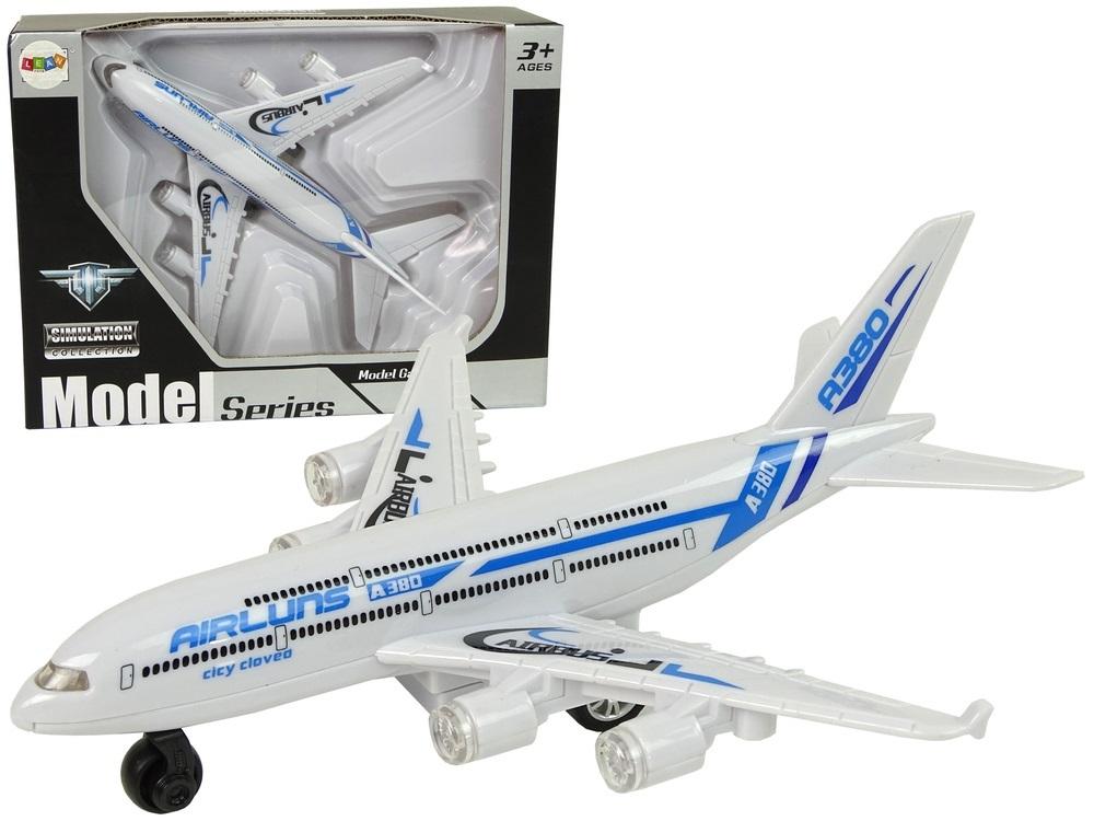 Gratka dla młodych fanów lotnictwa. Każdy maluch marzy, by być pilotem samolotu, te podniebne maszyny budzą podziw i zachwycają każdego małego odkrywce świata. Przedstawiamy biały samolot pasażerski z niebieskimi elementami. Dopracowany wygląd zabawki, przypomina jej realny odpowiednik, z pewnością sprawi, że rodzeństwo i rodzice z chęcią włączą się do wspólnej rozrywki. Ten model nie tylko posłuży dziecku do zabawy, ale i do ozdoby pokoju.