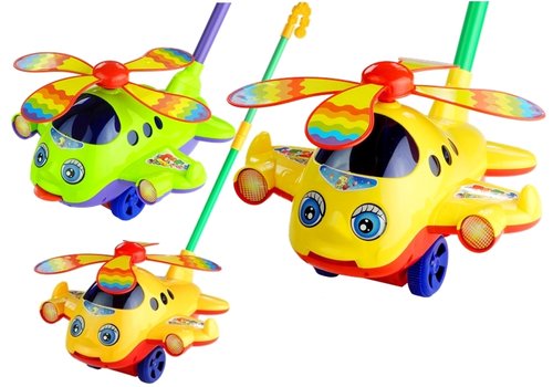 Samolot z ruchomym śmigłem i językiem Różnorodne dźwięki i kolory są bardzo istotne w prawidłowym rozwoju dziecka. Stymulują jego słuch i wzrok, a także zachęcają do podjęcia wesołej zabawy. Ponadto dzięki tej zabawce uśmiech nie będzie schodzić z buźki maluszka. Zabawkowy samolot-pchacz sprawi, że dziecko w krótkim czasie nauczy rozróżniać się nowe kolory czy kształty, a jego wyobraźnia zostanie pobudzona. Samolot dostępny jest w dwóch wariantach kolorystycznych: - żółto-czerwony samolot z zielonym pchaczem, - zielono-fioletowy samolot z fioletowym pchaczem. Zabawka posiada bardzo bezpieczną konstrukcję, co podkreśla jej opływowy kształt. Dwukolorowy kadłub samolotu ozdobiony jest granatową szybą imitującą kabinę pilota, a także okienka dla pasażerów, oraz okrągłymi, uroczymi oczkami. Skrzydła podniebnej maszyny posiadają detale, imitujące światła, oraz wesołe naklejki. Na dachu samolotu znajduje się wielokolorowe śmigiełko, które intensywnie porusza się wokół własnej osi, podczas gdy dziecko pcha zabawkę. Różnobarwne paski tworzą przepiękny efekt, który z pewnością zaciekawi każdego malucha. Dużą zaletą zabawki jest nie tylko jej wzornictwo, ale wielofunkcyjność. Podczas gdy dziecko pcha zabawkę, nie tylko kręci się śmigło samolotu — wystawia on języczek, a kuleczka znajdująca się w środku zabawki grzechocze przy każdym obrocie kół. Prowadnica dołączona do zestawu składa się z dwóch części — w czasie, gdy dziecko będzie chciało pobawić się samolotem na przykład w łóżeczku, można ją odpiąć. Wymiary zabawki: - samolot: 22 cm x 22 cm x 14,5 cm, - rączka: 54 cm.