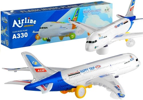 Jeżdżący samolot z efektami świetlnymi i dźwiękowymi Różnorodne samoloty to zabawki, które wybiera spora część dzieciaków. Podniebne maszyny umożliwiają dzieciom bardzo ciekawe i rozwijające zabawy, których scenariusze mogą być naprawdę oryginalne. Samoloty są również rewelacyjnymi dodatkami, które pomogą wytłumaczyć dziecku w przystępny sposób, na jakiej zasadzie samoloty unoszą się pośród chmur na niebie. Zabawkowy samolot powinien mieć bezpieczną, opływową konstrukcję, realne wzornictwo oraz efekty świetle i dźwiękowe — nasz odznacza się tym wszystkim, a ponadto jeździ! Samolot posiada napęd typu bump and go, co oznacza, że jeździ w wybranych przez siebie kierunkach, a gdy tylko natknie się na przeszkodę — odbija się i ponownie obiera nowy kurs. Zabawka zasilana jest 3 sztukami baterii AA 1,5 V, które umieszcza się w dolnej części zabawki. Po przesunięciu przełącznika podniebna maszyna zaczyna jeździć, czemu towarzyszą kolorowe, migające światełka, a także dźwięki przypominające start i lot samolotu. Prezentowany samolot posiada opływową, lekką konstrukcję. Jego kolorystyka to połączenie stonowanej bieli przełamanej niebieskimi detalami, a także żółtymi kołami. Dodatki pod postacią napisów i oznaczeń, na przykład „Happy trip” czy „A330” sprawiają, że samolot wygląda niemalże jak prawdziwy. Dziecięcy samolot wykonany jest z dbałością o najmniejsze szczegóły — w jego budowie można dostrzec kabinę pilota z ciemnymi szybami, a nawet okienka dla pasażerów — pozwalają one zajrzeć do środka maszyny. Skrzydła samolotu zdobią silniczki, w których umieszczone są diodki. Warto wypróbować tę zabawkę w ciemnym pokoju — efekty będą fenomenalne! Zabawka dla fana lotnictwa posiada certyfikat CE, gwarantujący bezpieczeństwo płynące z jej użytkowania. Wykonana jest z bezpiecznego dla dzieci, trwałego i solidnego materiału, który jest gwarancją długiej żywotności zabawki. Przedmiot zapakowany jest w estetyczne pudełko, będzie rewelacyjnym prezentem dla dziecka. Wymiary zabawkowego samolotu: - 43 cm x 45 cm x 14,5 cm. Wymiary opakowania: - 45 cm x 12 cm x 8 cm.