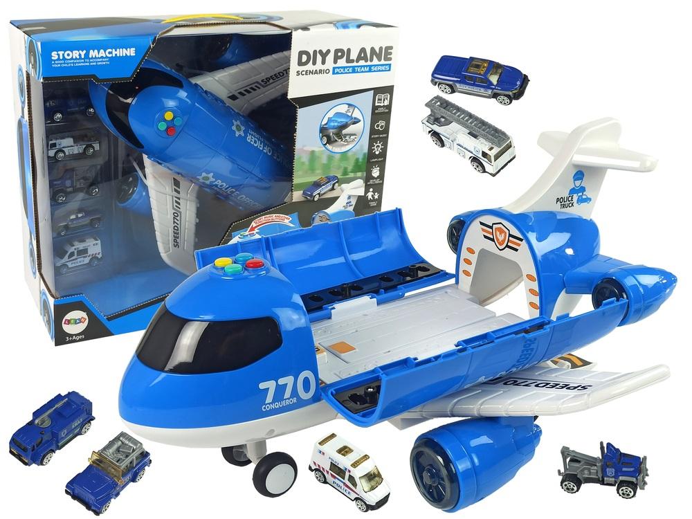 Samolot Transportowy Policja z Naciągiem Autka Dźwięk Super prezent dla fanów samolotów. Przedstawiamy biało-niebieski samolot tworzący bazę dla pojazdów policyjnych, ułatwi to transportowanie pojazdów na akcje. Wystarczy załadować wszystkie maszyny na pokład i ruszyć w drogę łapać złodziei. Samolot wypełni beztroską długie wieczory, rozwinie wyobraźnie dziecka i dzięki temu też dowie się, na jakiej zasadzie samoloty unoszą się na niebie i działają. Zabawka posiada frykcyjny napęd, wystarczy nacisnąć na tył, puścić do przodu i cieszyć się prędkością. Rodzeństwo i rodzice z chęcią włączą się do wspólnej rozrywki i zabawy. Wewnątrz samolotu można przewozić miniaturowe wersje pojazdów policyjnych, z nimi żadna terenowa akcja policyjna nie jest straszna. Otwierany bok samolotu pozwalają na włożenie autek do środka, otwierana tylna rampa umożliwia samochodom opuścić pokład. Wewnątrz znajduje się także przycisk GO, który ustawia rampę pochyloną, co usprawnia opuszczenie samolotu. Efekty dźwiękowe dodają atrakcyjności naszemu podniebnemu pojazdowi i na pewno nikt nie przeoczy samolotu na swojej drodze, odpowiedzialne są za to cztery przyciski na dachu. Sygnał uruchamiania pojazdu, odgłosy syreny policyjnej bądź wesoła muzyka pozwoli się przenieść w świat akcji policyjnych. W zestawie znajdują się: - samolot policyjny garaż - 6 autek policyjnych różnego rodzaju Wymiary małych autek: około 7 cm x 3 cm x 3 cm Wymiary samolotu: 37 cm x 36 cm x 21 cm Wymiary opakowania zabawki: 46 cm x 31,5 cm x 14 cm Prezentowany model samolotu jest wykonany z atestowanego, trwałego materiału, co w połączeniu z dbałością o każdy detal gwarantuje bezpieczeństwo zabawy i jakość radzącą sobie z częstym używaniem. Samolot zasilany jest 3 sztukami baterii 1,5 V AA , które nie są dołączone do zestawu. Zabawka posiada certyfikat CE, wykonana jest z bezpiecznego dla dzieci, solidnego i trwałego materiału, który jest gwarancją długiej żywotności. Produkt przeznaczony dla dzieci powyżej 3 roku życia.