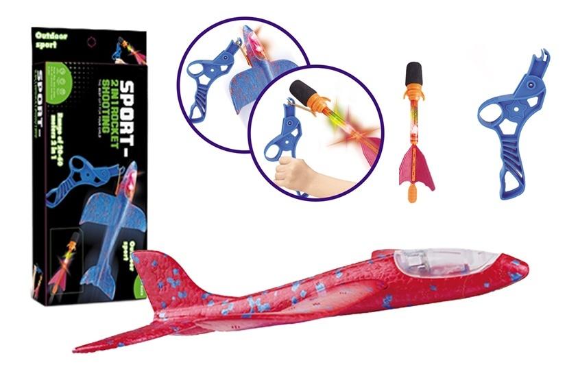 W zestawie: samolot - szybowiec dł.: 21,5 cm, pocisk, wyrzutnia; funkcje: wyrzutnia umożliwia wystrzeliwanie samolotu lub pocisku, efekty świetlne w samolocie i w pocisku; wym. opak.: 30 x 12,5 x 4 cm; baterie: 3 x AG13 (samolot), 3 x AG13 (pocisk) dołączone; 3+