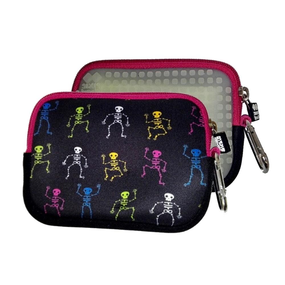 Wielofunkcyjna saszetka do codziennego użytku PIXIE CREW czarna z motywem kolorowych szkieletów oraz kreatywnym panelem lśniącym w ciemności, na którym można tworzyć oryginalne i spersonalizowane grafiki, za pomocą małych silikonowych pikseli. Wykonana jest z praktycznego, wytrzymałego na wstrząsy i uderzenia neoprenu. Saszetka jest zapinana na suwak, z boku umieszczono karabińczyk. Wewnątrz znajduje się wystarczająco dużo miejsca na małe przedmioty codziennego użytku, takie jak klucze, kosmetyki, karty, pieniądze, czy inne drobiazgi. Saszetka jest sprzedawana z dodatkowym darmowym zestawem około 100 kolorowych pikseli.