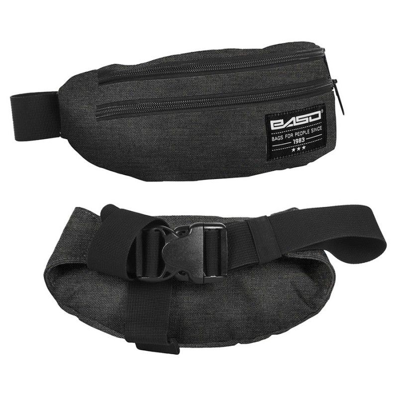 Saszetka na pas, nerka. Jedna pojemna komora, jedna kieszonka z przodu, regulowany pasek zapinany na klamrę.