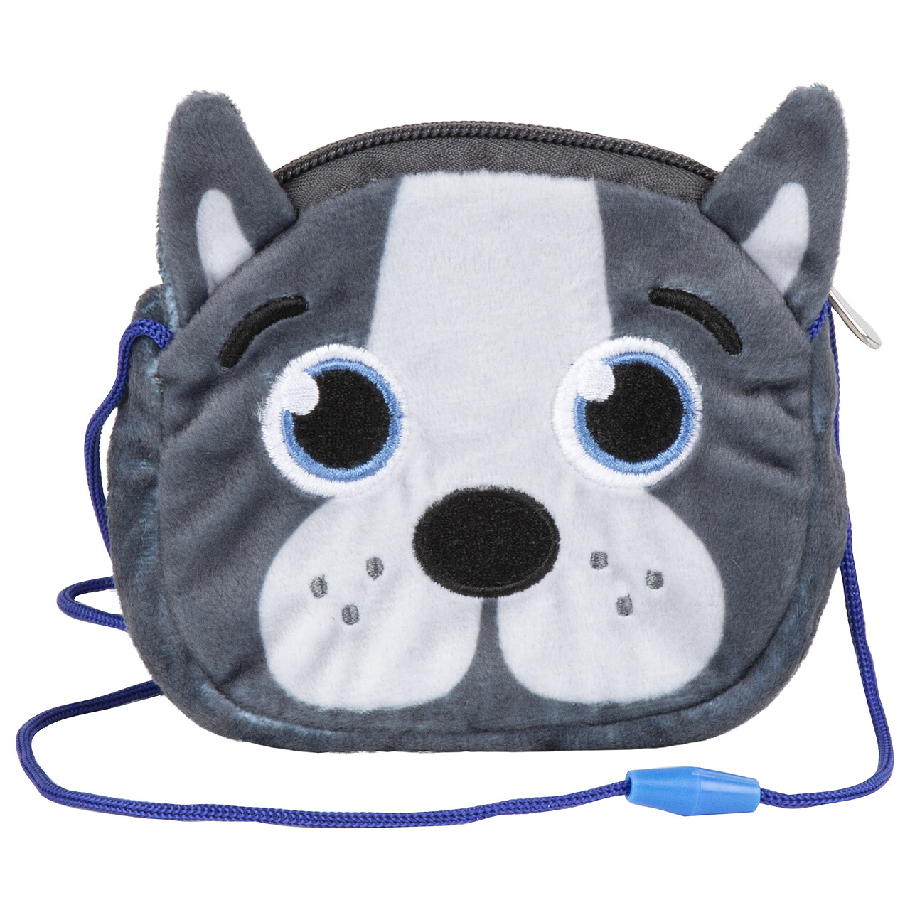 Pluszowa, okrągła saszetka ze zwierzęcym designem. Miękka, wykonana z wysokiej jakości pluszu, jednokomorowa, z zamkiem błyskawicznym oraz sznurkiem ze złączką bezpieczeństwa.