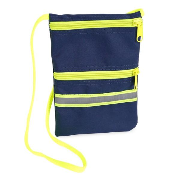Tekstylna torebka na szyję ze sznurkiem do ściągania, 1 kieszeń z zamkiem błyskawicznym, przezroczysta tylna strona z zapięciem na guzik, zadrukowana powierzchnia z aplikacją z cekinów, 11 x 13,5 cm (w x h).