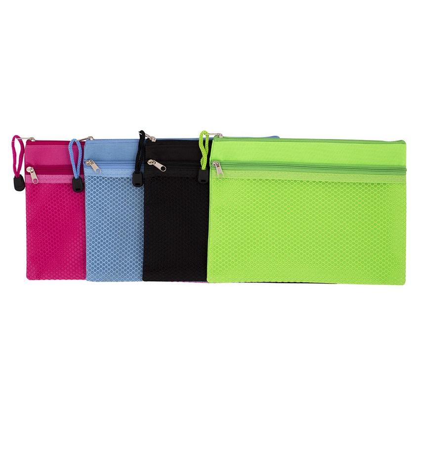 Poręczna saszetka wykonana z trwałego tworzywa zamykana na zamek. Może być używana jako kosmetyczka, saszetka na drobne akcesoria lub dokumenty. Posiada dodatkową kieszeń z przodu wykonaną z siateczki. Doskonale sprawdza się w podróży, na plaży itp. Rozmiar A5. Różne kolory, towar wysyłany losowo.