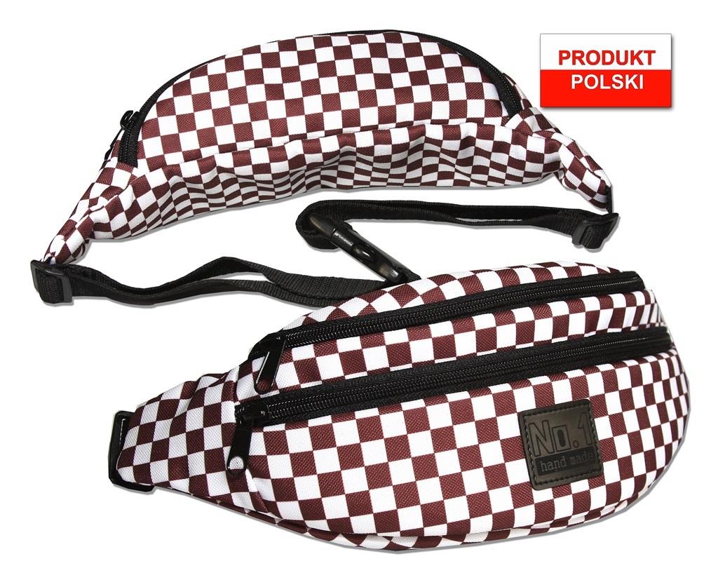 Saszetka/nerka wykonana z kodury, ozdobiona nadrukiem przedstawiającym kratę wykonanym w technologii sublimacji. Wyrób posiada 2 zamki błyskawiczne, a co za tym idzie 2 niezależne komory. Pasek posiada regulator umożliwiający dostosowanie długości paska do użytkownika. Wyrób o wymiarach 35x14x8[cm]. Kolor brązowy. Wyrób bez wyposażenia.