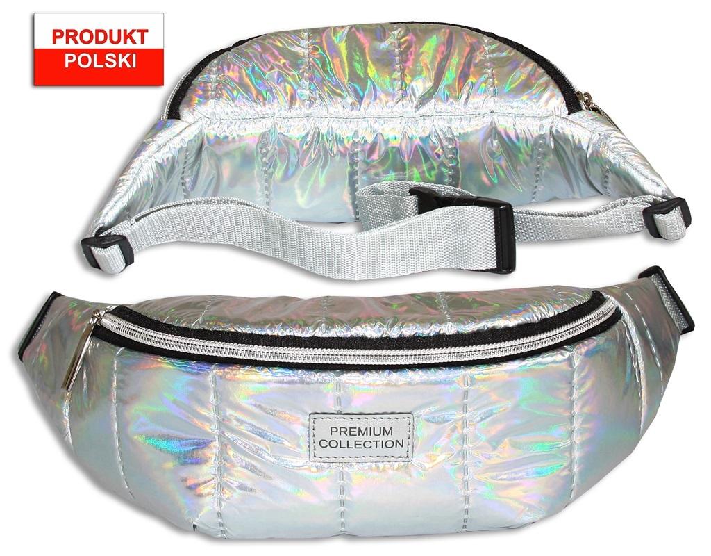 Saszetka/nerka wykonana z tkaniny o wysokim połysku, ozdobionej naszywką. Wyrób posiada 1 zamek błyskawiczny, a co za tym idzie 1 kieszeń. Pasek posiada regulator umożliwiający dostosowanie długości paska do użytkownika. Wyrób o wymiarach 35x10x8[cm]. Kolor srebrny. Wyrób bez wyposażenia.