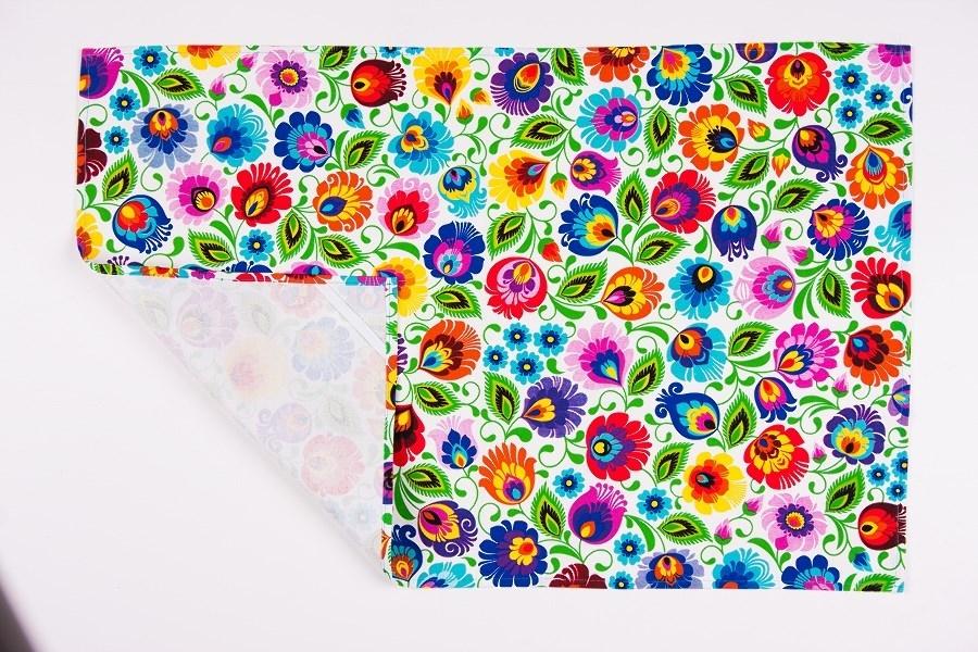 biała z nadrukowanymi kolorowymi kwiatami łowickimi,posiada uchwyt do zawieszenia,zachwyca intensywną gamą kolorów,zalecamy prać w temp. 40 ,prasować w max. temp. 160 ,grubość materiału 200 g/m2.